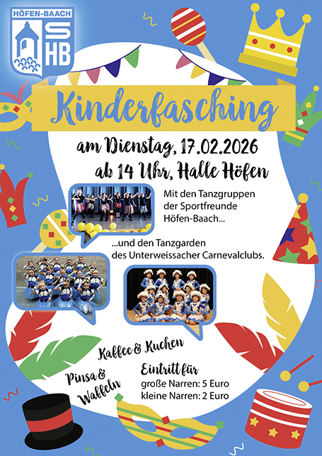 Kinderfasching bei den Sportfreunden Am Faschingsdienstag, den 17. Februar 2026 findet in der Gemeindehalle Höfen-Baach wieder der traditionelle Kinderfasching statt. Saalöffnung ist um 14.00 Uhr. Für das leibliche Wohl ist bestens gesorgt. Wir freuen uns auf euer Kommen. |