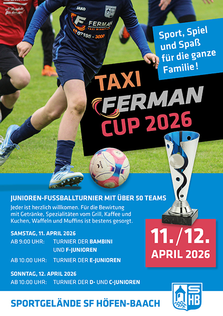 Junioren-Fussballturnier 2. Taxi Ferman-Cup 2026 Vom 11. bis 12. April 2026 findet auf dem Höfen-Baacher Sportgelände das große Fussballjugendturnier für G- F-, E- und D-Junioren statt. Über 50 Teams sind am Start. Die Jugendfussballabteilung bedankt sich besonders für die Unterstützung von Taxi Ferman bei diesem Event. Bilder vom 1. Taxi Ferman-Cup 2025 sind im Vereins-Blog zu sehen. |